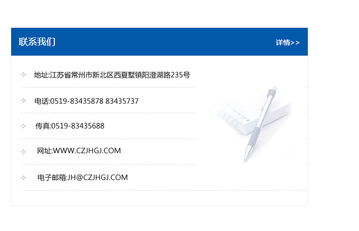 地址:常州市新北區友邦商務大廈1幢16、17層  電話:0519-85101652  傳真:0519-85112595  郵編:213022  網址:www.cz-jiayue_cn.nei5.com  郵箱:xiajifengaa@163.com